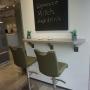 Ergänzend zur Küche in L-Form umfasst der Angebotspreis auch eine kleine Tresenlösung für einen kurzen Kaffee am Morgen einschließlich zwei Hocker mit Edelstahlfuß und Lederbezügen.