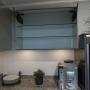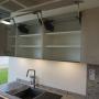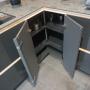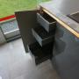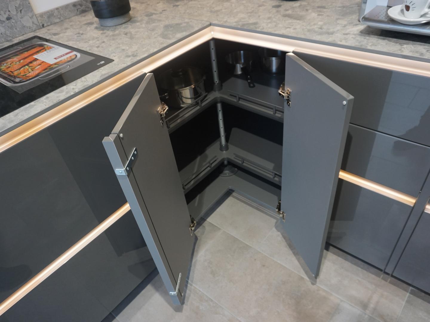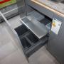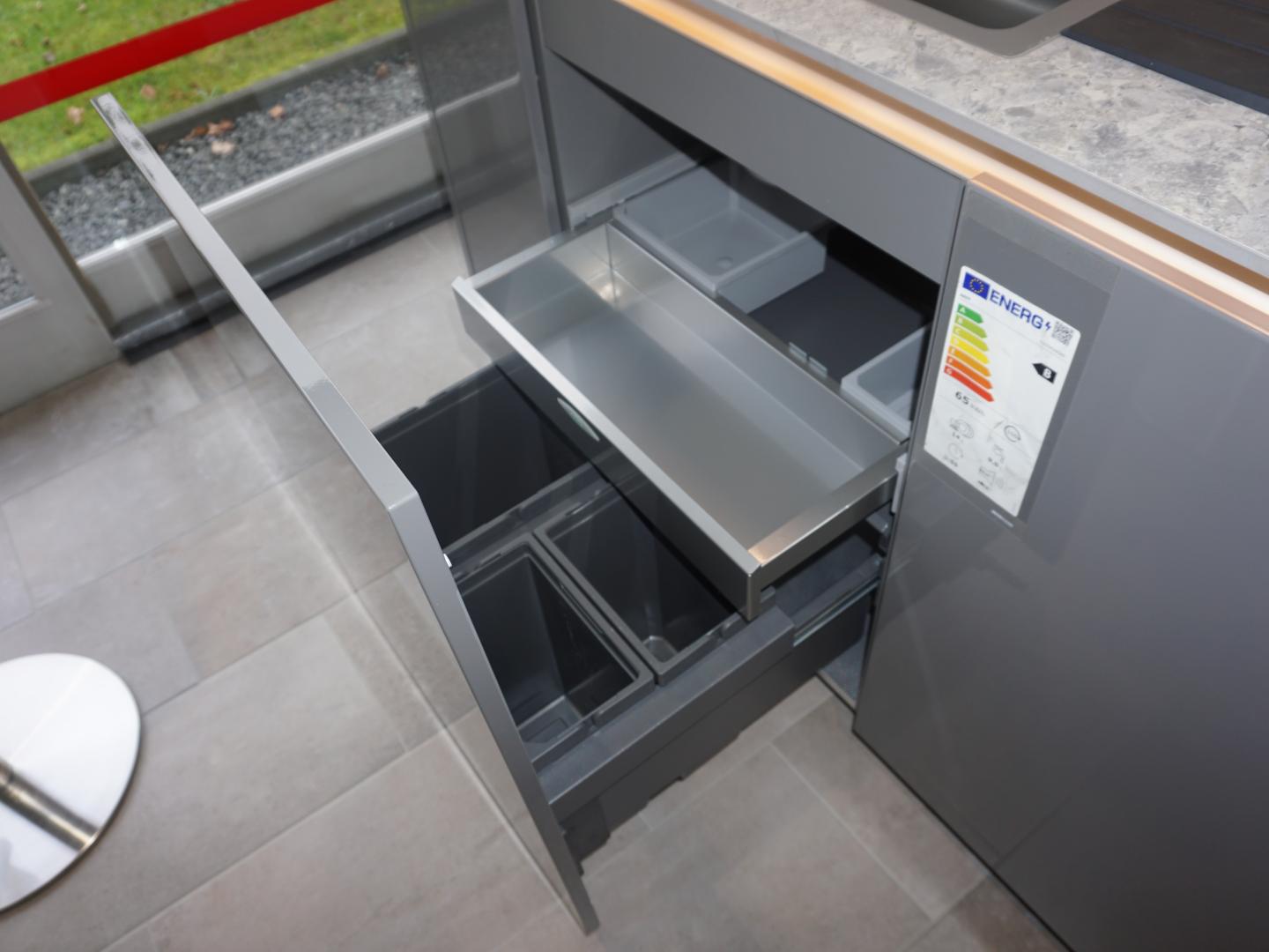 Unter der Spüle befindet sich ein Abfallsystem, welches Ordnung und Komfort verbindet. Durch die Planung eines Eckhängeschrankes und eines Karussells unterhalb der Arbeitsplatte geht kein Stauraum verloren.