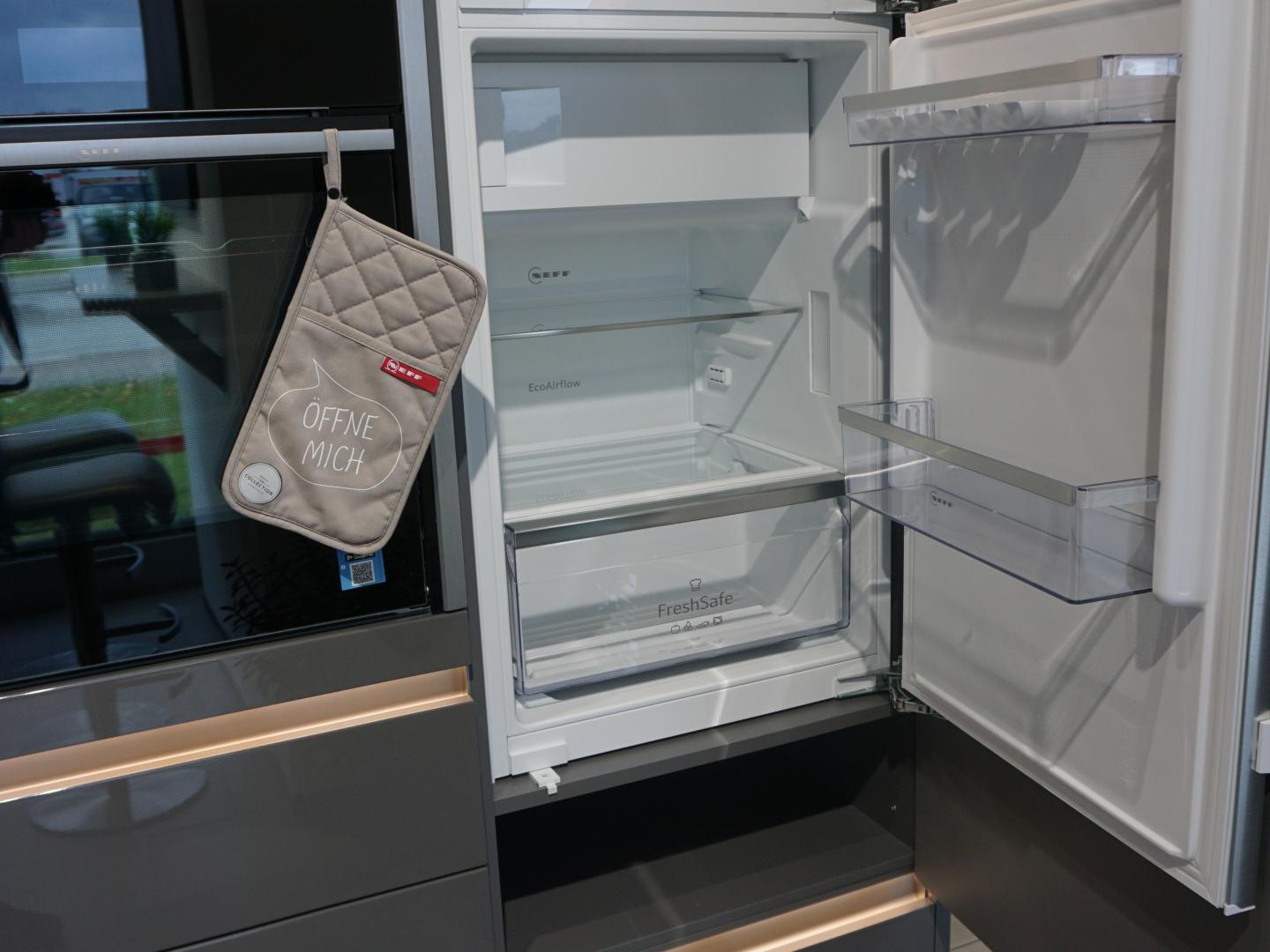 Zusätzlicher Komfort bieten sowohl der hoch eingebaute Kühlschrank als auch der hoch eingebaute Backofen mit versenkbarer Tür.