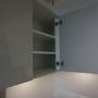 Ein echter Blickfang ist diese hochglänzende Küche, deren Unter- und Seitenschränke im Farbton Quarzgrau und die Hängeschränke im Farbton Sandbeige gestaltet sind. Eine Verbindung der Farben erfolgt über die 12 mm starke Keramikarbeitsplatte, in die die Keramikspüle und auch das Induktionskochfeld flächenbündig eingearbeitet sind. Durch das grifflose Design scheint die Arbeitsplatte zu schweben. Unterstützt wird dieser Eindruck vom Spiegelsockel. Die Beleuchtung der Griffleistenprofile ist ebenso über eine Fernbedienung steuerbar wie die Beleuchtung unter den Hängeschränken.
