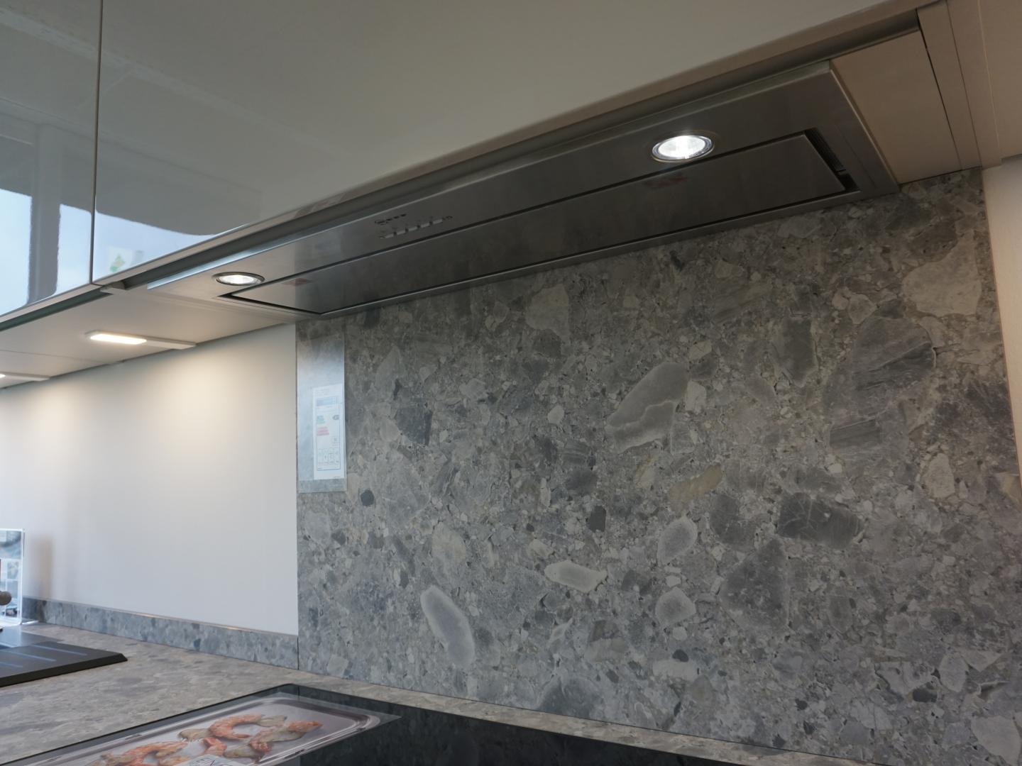 Hinter dem Kochfeld schützt eine Keramikrückwand vor Verschmutzung der Wand.